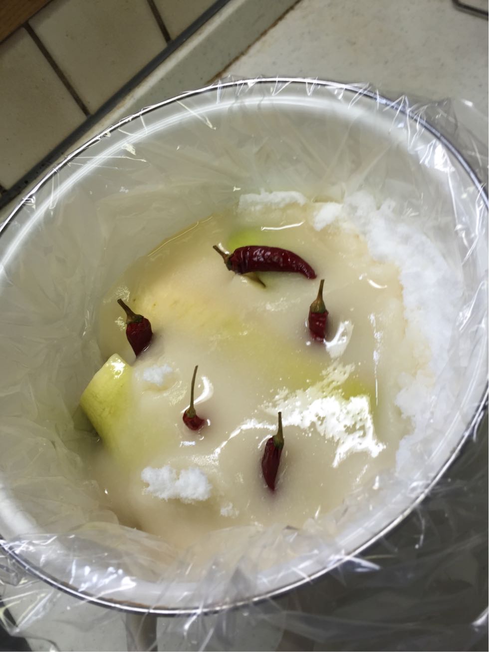 これで完成。2日位で水が出てきます。3ー4日で食べられますが、少し置いたほうがちょうど良い塩加減になります。