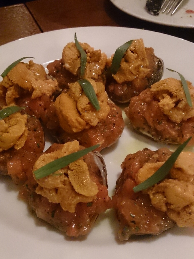 軍艦巻き!?ってくらいたっぷりな雲丹にブルスケッタっぽいトマトとぷりっぷりなハマグリ。